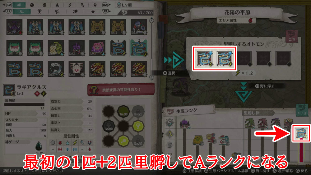 里孵ししたエリアにあるモンスターの巣を巡り、ラギアクルスのタマゴを集めて里孵ししよう。花陽の平原の場合、最初の1体を含めて合計3体里孵しすれば、突然変異の条件である生態ランクAを達成可能だ。