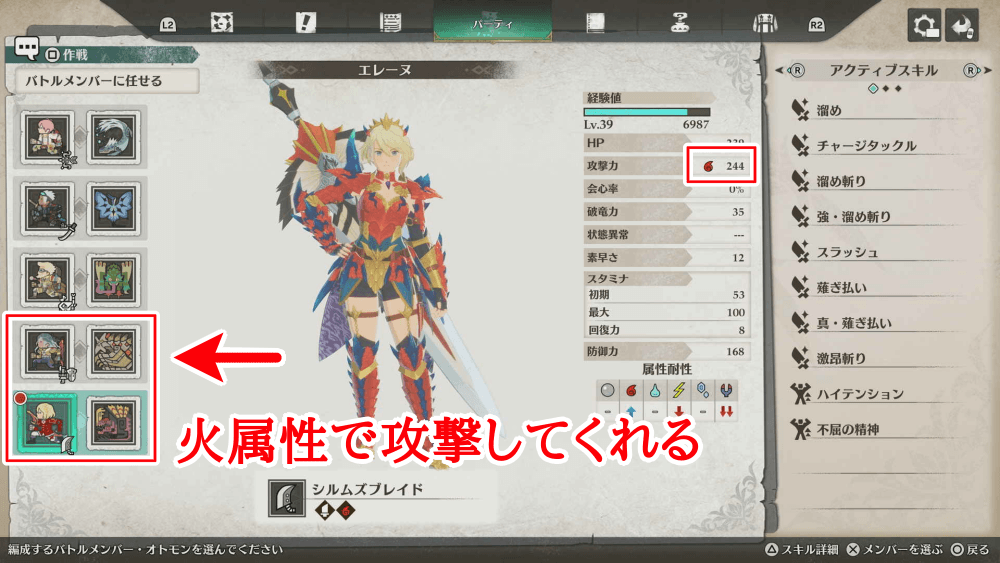 固定パーティのレウスは火属性だが、火属性攻撃を習得するにはレベルが30必要になる。レベルが足りない場合はイャンクックやアンジャナフを用意し、パーティに編成するか、伝承の儀で火属性攻撃を継承すると良い。