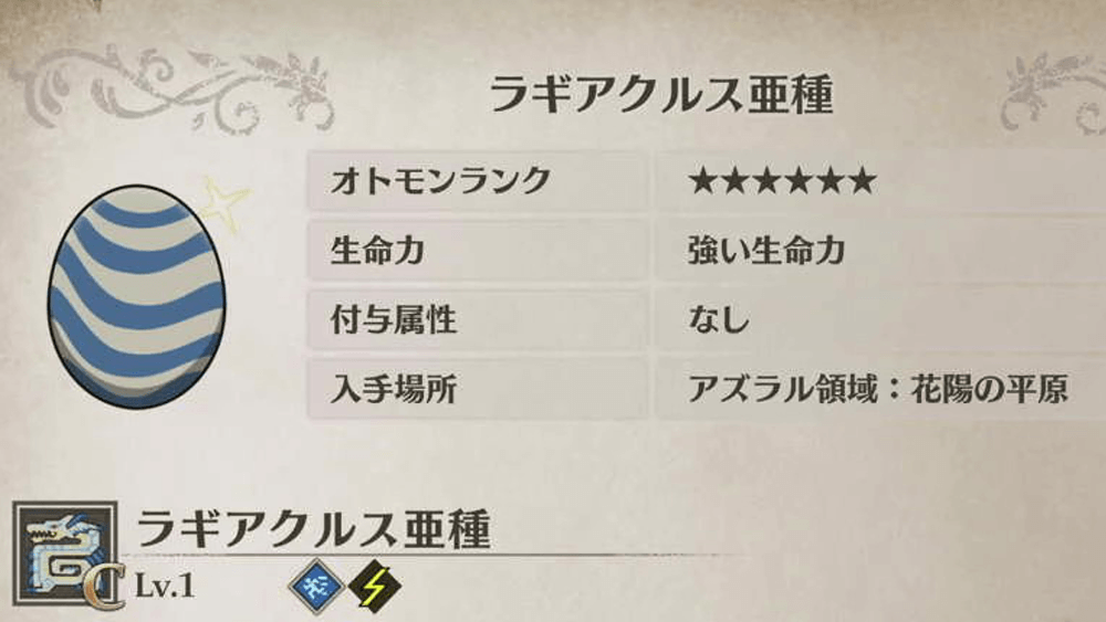 突然変異でラギアクルス亜種が生態ランクに追加されたら、再びモンスターの巣を巡ってラギアクルス亜種のタマゴを探そう。ラギアクルス亜種のタマゴを入手できたら、厩舎で孵化させてパーティに編成する。