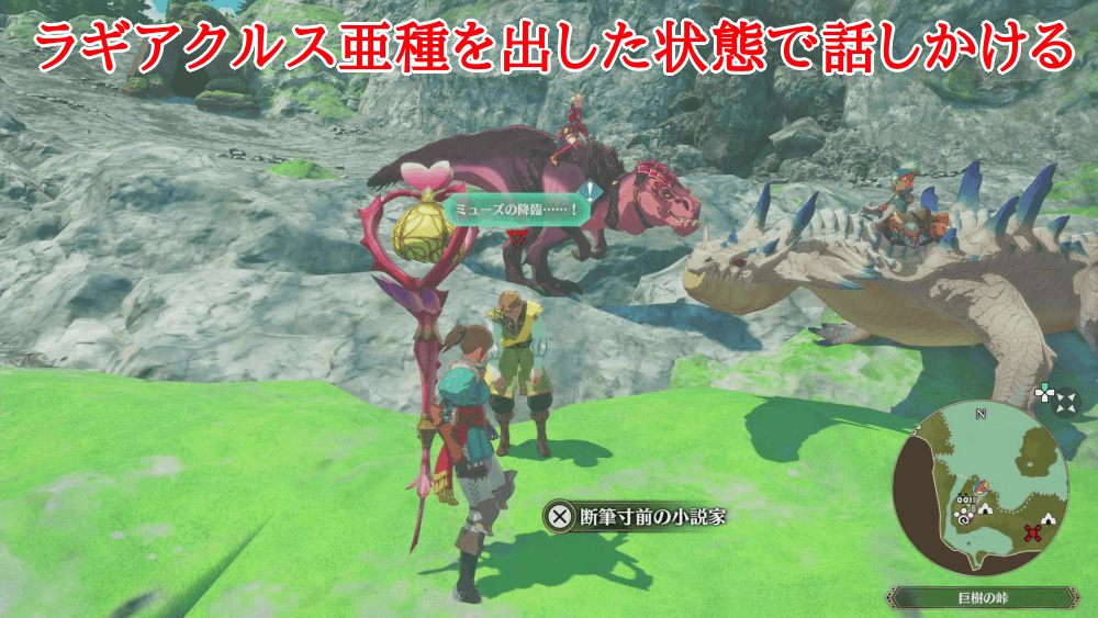 ラギアクルス亜種をパーティに編成したら、依頼人の場所まで行ってラギアクルス亜種を見せよう。ラギアクルス亜種をフィールドに出した状態で話しかけると、依頼完了の報告ができる。