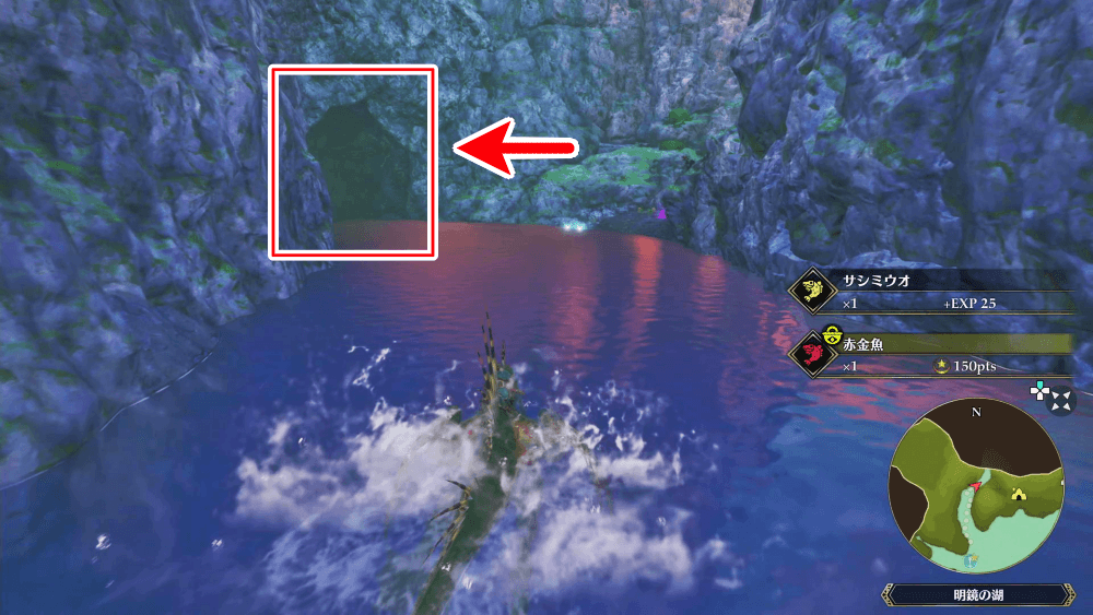 マップ 外観 準備ができたら、時間帯を夜にして明鏡の湖の北へ向かおう。川を北上した先に洞窟があり、洞窟内に侵獣ガノトトスが出現している。遭遇前に洞窟内で侵獣の痕跡を集めておくと、戦闘中に味方がヒントを出してくれる。