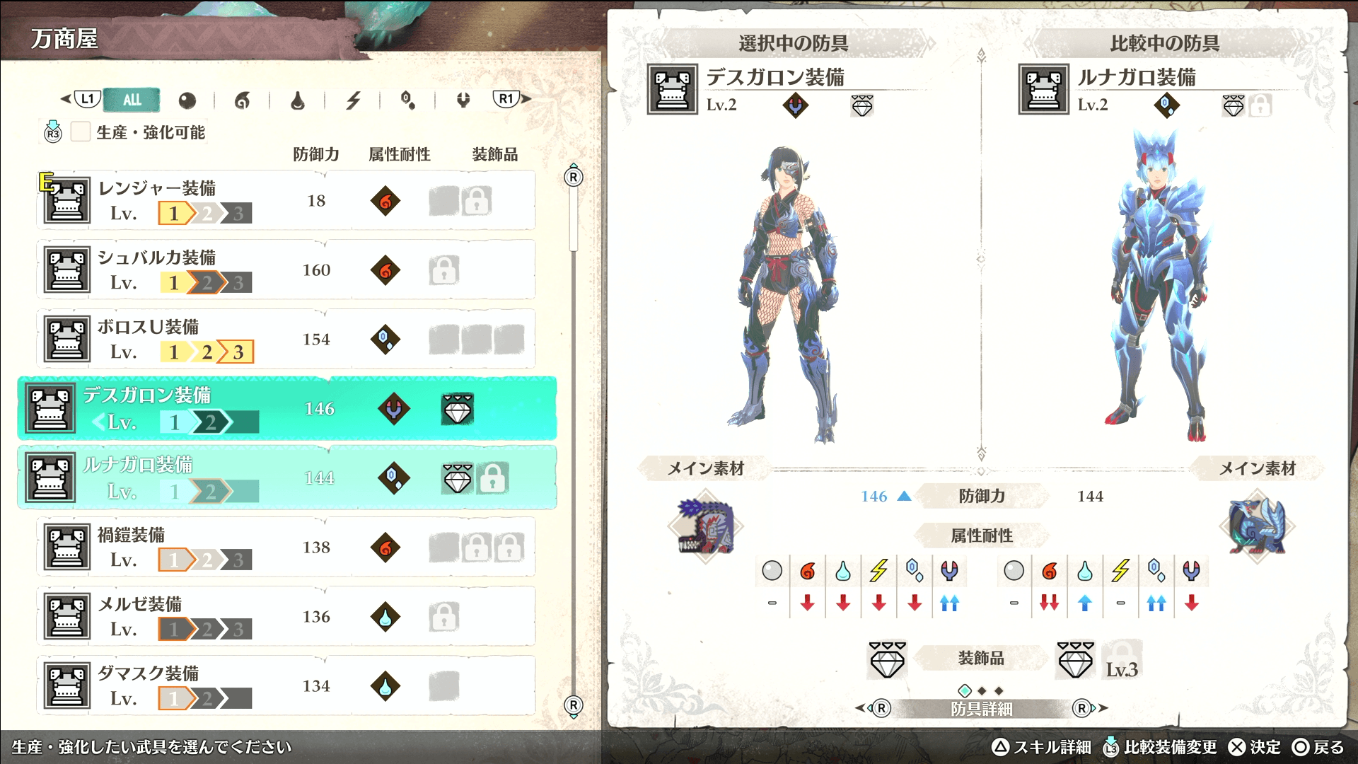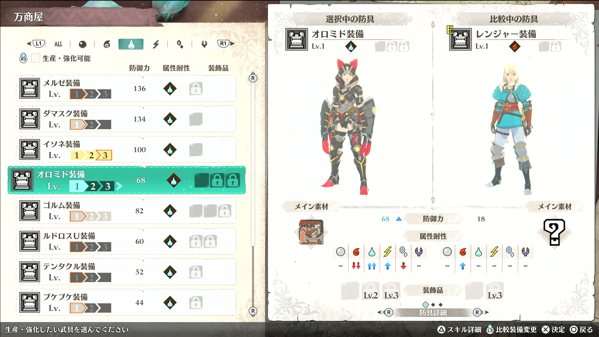 アジャラカン戦以降は水と雷の強制戦闘が連続するため、両方に耐性を持つ「オロミド防具」を作って進もう。防御が高い上、「属性特効・破龍/部位【中】」を持ち、弱点属性のダメージと竜気ダメージが増加する。装飾品枠も空いているため、相手に合わせた属性防御珠で対策が取れる。