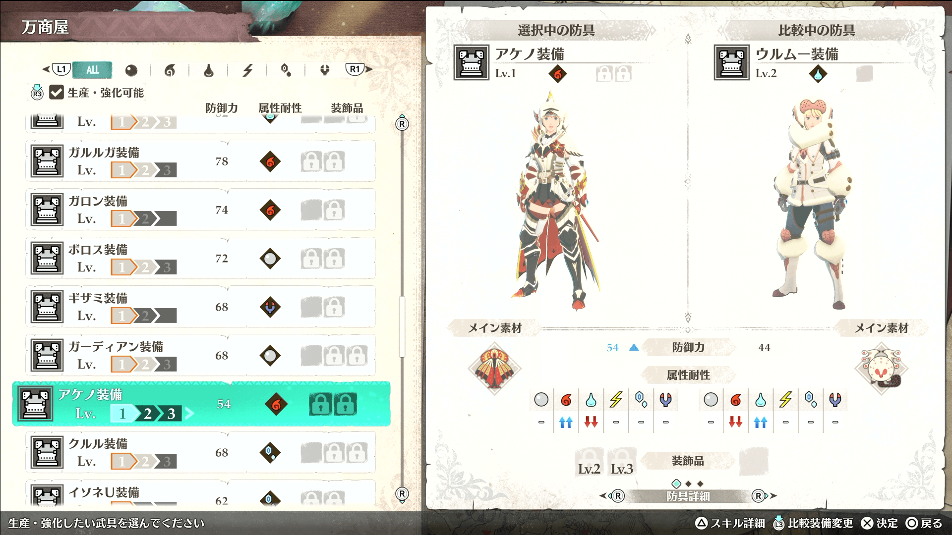 ガライャド編に入ると、直後に水・火属性の強敵と戦闘になるため、事前に2属性の防具を作っておくと良い。防御よりも耐性が重要になるため、ガーディアンより防御が低い「アケノ装備」や「ウルムー装備Lv2」を使ったほうが、強敵を倒しやすくなる。