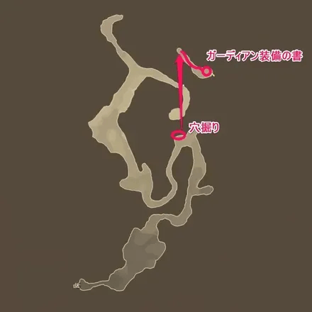ガーディアン装備のレシピは、龍の八ツ峰北東の宝箱から手に入る。向かうには地中移動のオトモンが必須となるため、必ずガルクを編成に入れてから向かおう。