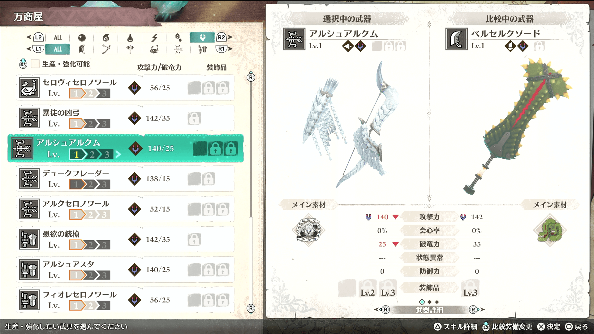 強制戦闘で戦ったアルシュベルドの素材からは、シュバルカ防具を作ると良い。4属性に耐性を持ち、スキルも汎用性が高いため、多くのモンスターに対して有利に戦える。超竜化リオレウス亜種/ルナガロンとの戦闘でも使えるため、素材は防具に回し、龍属性武器はほか素材での作成を推奨する。