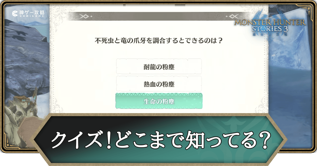 | 第1問 | 不死虫と竜の爪牙を調合するとできるのは?答え:生命の粉塵 |
