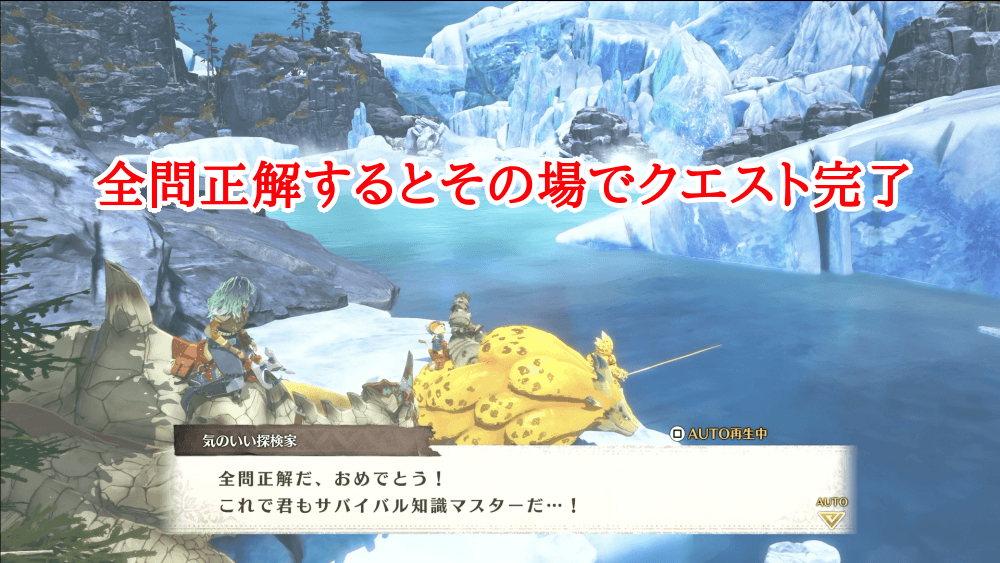 クエストを受注してから、もう一度話しかけるとクイズを出題される。クイズは全部で3問あるが、3択かつ間違えてもすぐにやり直せるため、答えを知らなくても何度か挑戦すればクリアは可能だ。