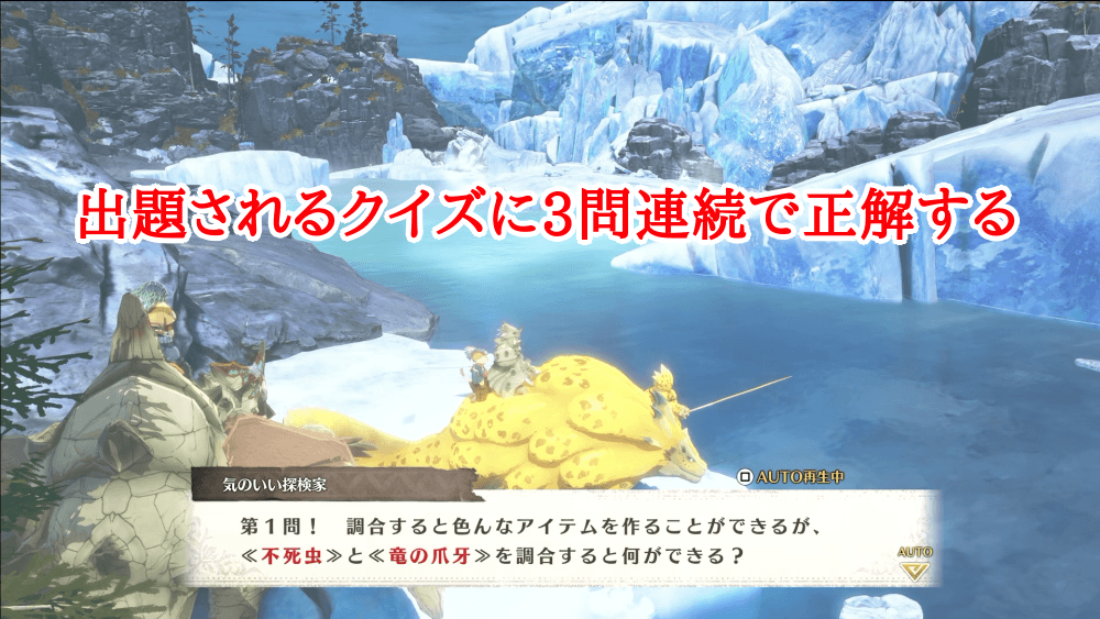 問題と答え 第1問 不死虫と竜の爪牙を調合するとできるのは?答え:生命の粉塵 第2問 リオレウスと一緒に里孵しすると効率がいいのは?答え:アジャラカン 第3問 夜時間に起きない変化は?答え:ルナガロンが立つ