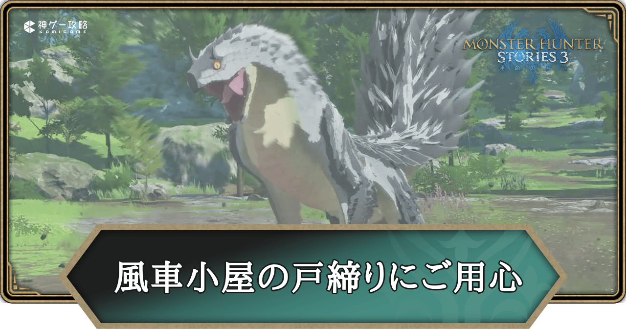 モンハンストーリーズ3のクエスト「風車小屋の戸締りにご用心」を解説。MHST3の風車小屋の戸締りにご用心の受注場所や報酬、攻略チャートに加え、トビカガチの場所についても掲載しています。