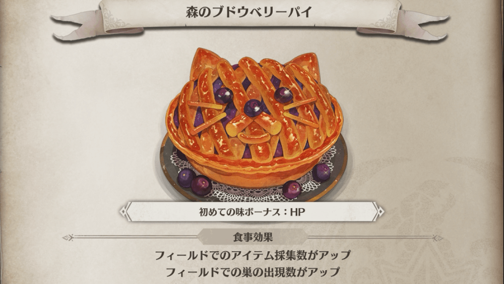 レアな巣を効率よく探すなら、探索前に料理「森のブドウベリーパイ」を食べよう。森のブドウベリーパイは、巣の出現数をアップさせる効果があり、巣が増えるのに比例してレアな巣の出現確率も上がる。レアな巣探しを効率化してくれるため、巣の探索前に必ず食べておこう。