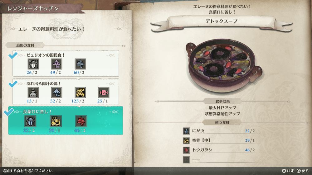 思い出はニガ玉の味をクリアすると、デトックスープのレシピを入手できる。デトックスープは最大HPアップと状態異常耐性アップの効果を持つため、状態異常が厄介な敵と戦う際に食べると良い。
