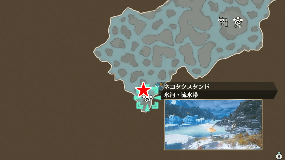 マップ 外観 ネコタクスタンド「氷河・河岸」へ移動し、岩場を登って南側にある目的地に近づこう。目的地には強化竜ディノバルドがいるため、目印にして近づくと良い。