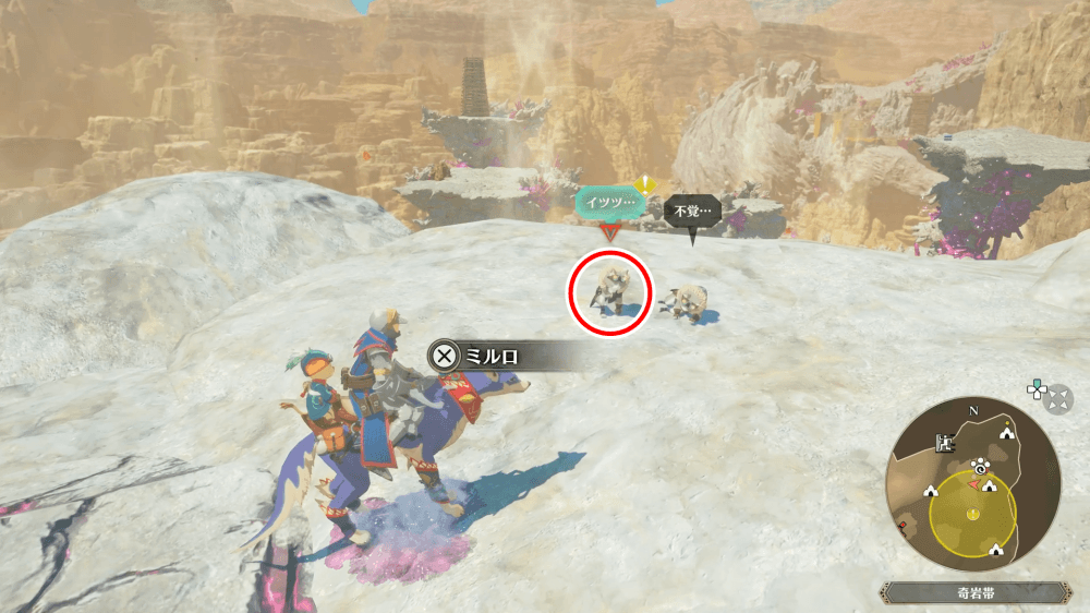 マップ 外観 ネコタクスタンド「奇岩帯」にファストトラベルし、ネコタクスタンドがある岩の上にいるミルロと話そう。ミルロとの会話イベント後は、氷河の入口へ行く流れとなる。