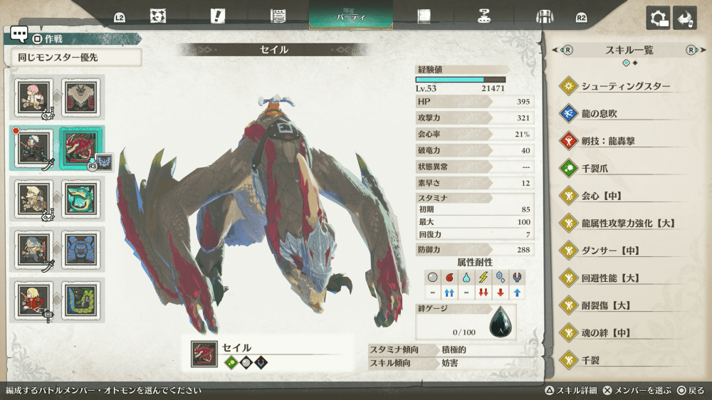 友としてをクリアすると、ガウルのオトモンにセルレギオスのセイルが加入する。セイルは無属性と龍属性を持つ双属性であり、すべての攻撃タイプを使用可能な汎用性の高いオトモンだ。
