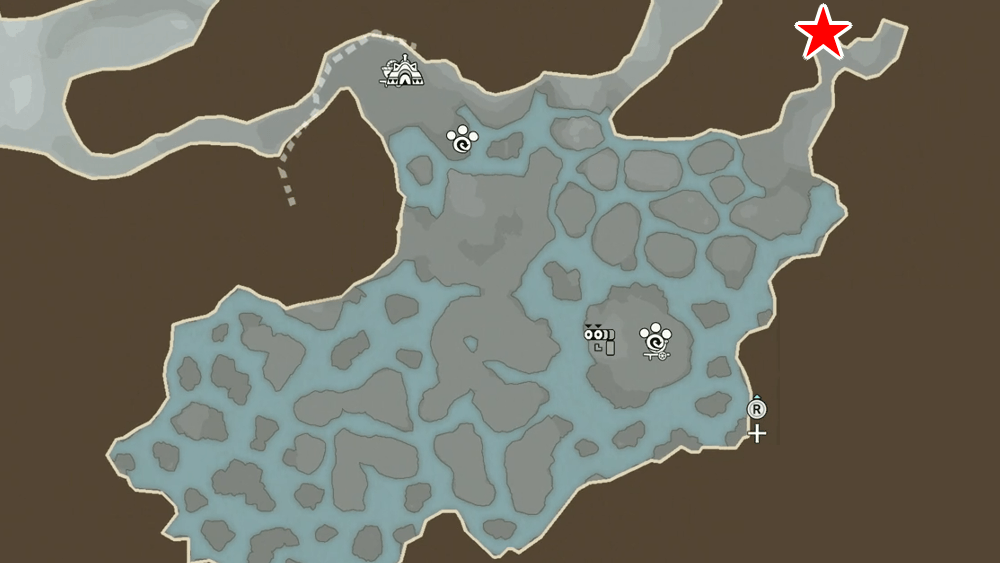 目的地へは、東端の陸地からジャンプで大蝕龍蟲の居る岩場に登り、岩を渡っていくと辿り着ける。東端の陸地へは、ネコタクスタンド「観測台:氷河」から飛行で岩場を乗り継いで行くか、水上移動のオトモンに乗って行くと良い。