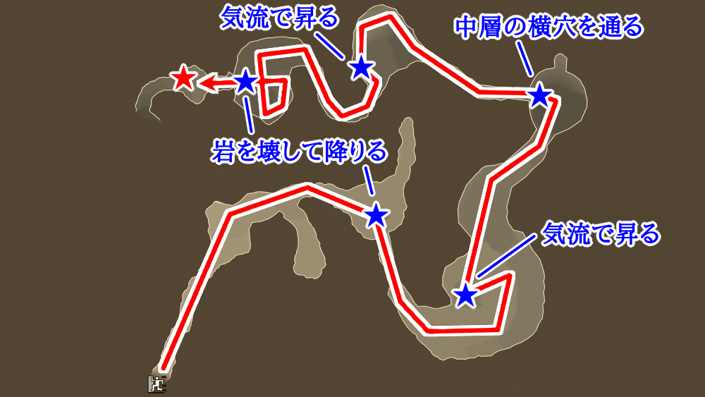 奈落の氷穴に入ったら、飛行と上昇気流を駆使して最奥部へ進もう。マップ北東部の上昇気流のある長い縦穴では、東側にある横穴に入ると先に進める。マップ北西部の突き当りでは、ジャンプで段差を越え、岩を破壊して進もう。