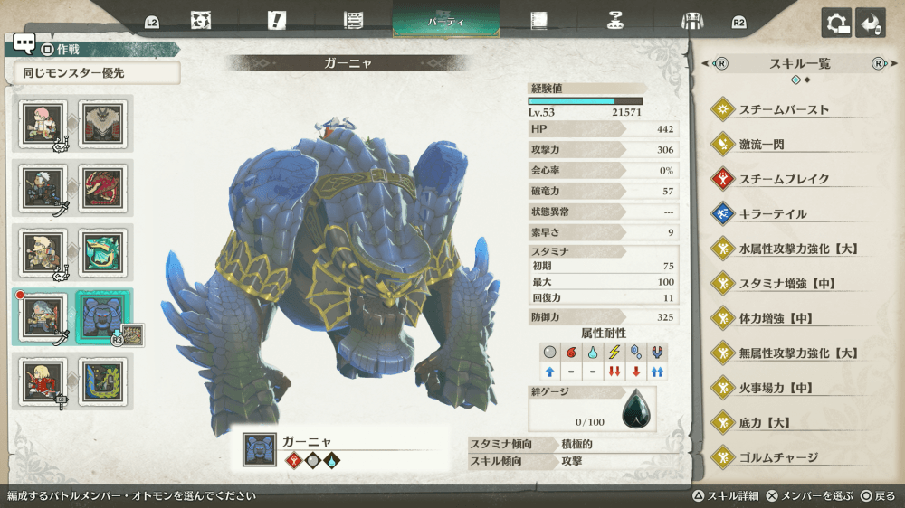 居場所をクリアすると、キートのオトモンにガランゴルムのガーニャが加入する。ガーニャは無属性と水属性の双属性オトモンであり、グーニャよりも対応範囲とスタミナ回復面で優秀だ。