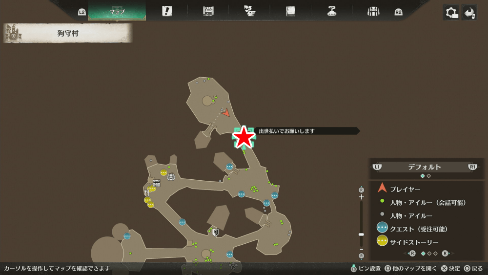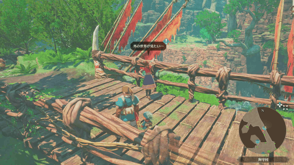 マップ 外観 クエストを受注するために、狗守村にいる「独り立ちしたい女性」に話しかけよう。独り立ちしたい女性は、狗守村の北側にある橋の上に立っている。