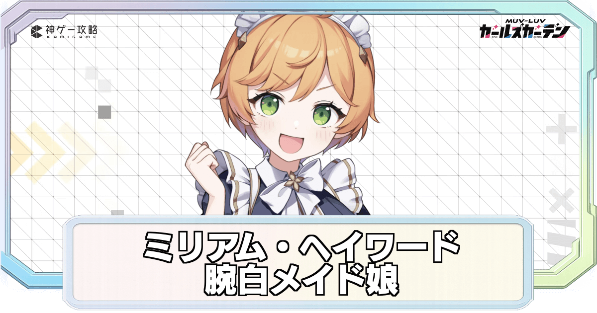 マブガル(マブラヴ ガールズガーデン)の【腕白メイド娘】ミリアム・ヘイワード(SR・スマート)の性能評価やステータスなどを掲載。キャラの強さやステータス、スキル一覧も紹介しているため、ミリアムの強さの確認や参考する際にどうぞ。