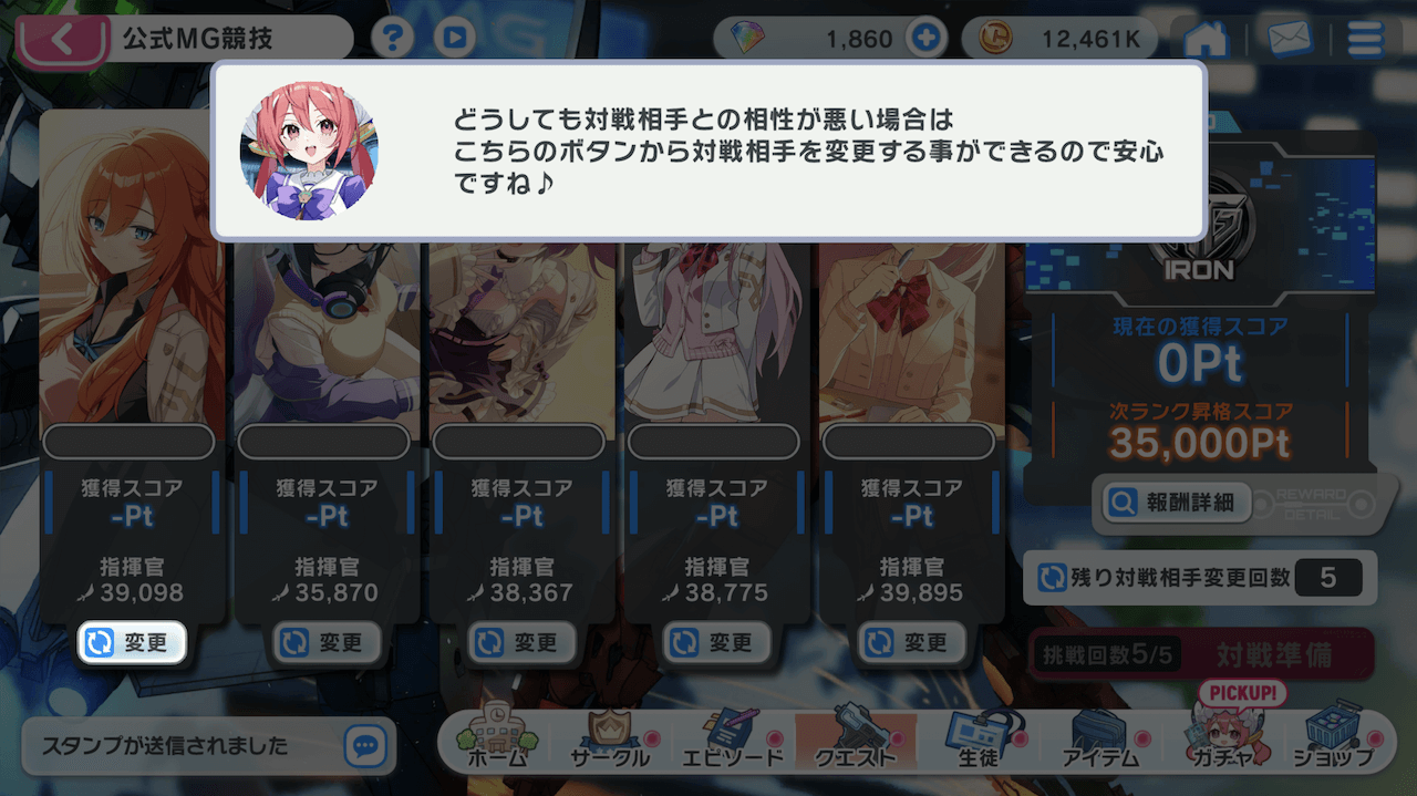 対戦を行う際、5人の相手が自動で選ばれるが、編成を確認して勝てなさそうな相手が出た場合は、変更権利を使用して対戦相手を変えよう。1日5回までは変更を行えるため、勝てる相手に変えてより高いスコアを出しておくのがおすすめだ。
