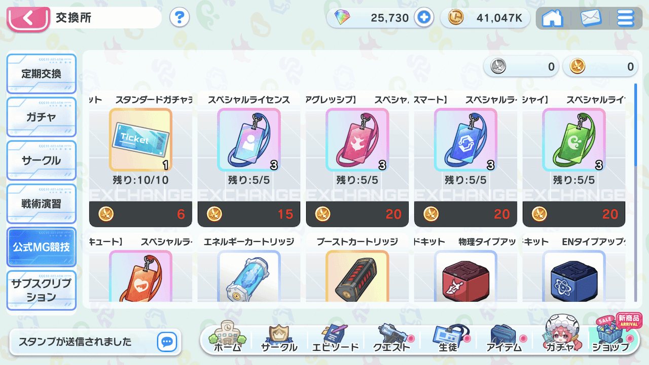 公式MG競技の交換アイテム一覧