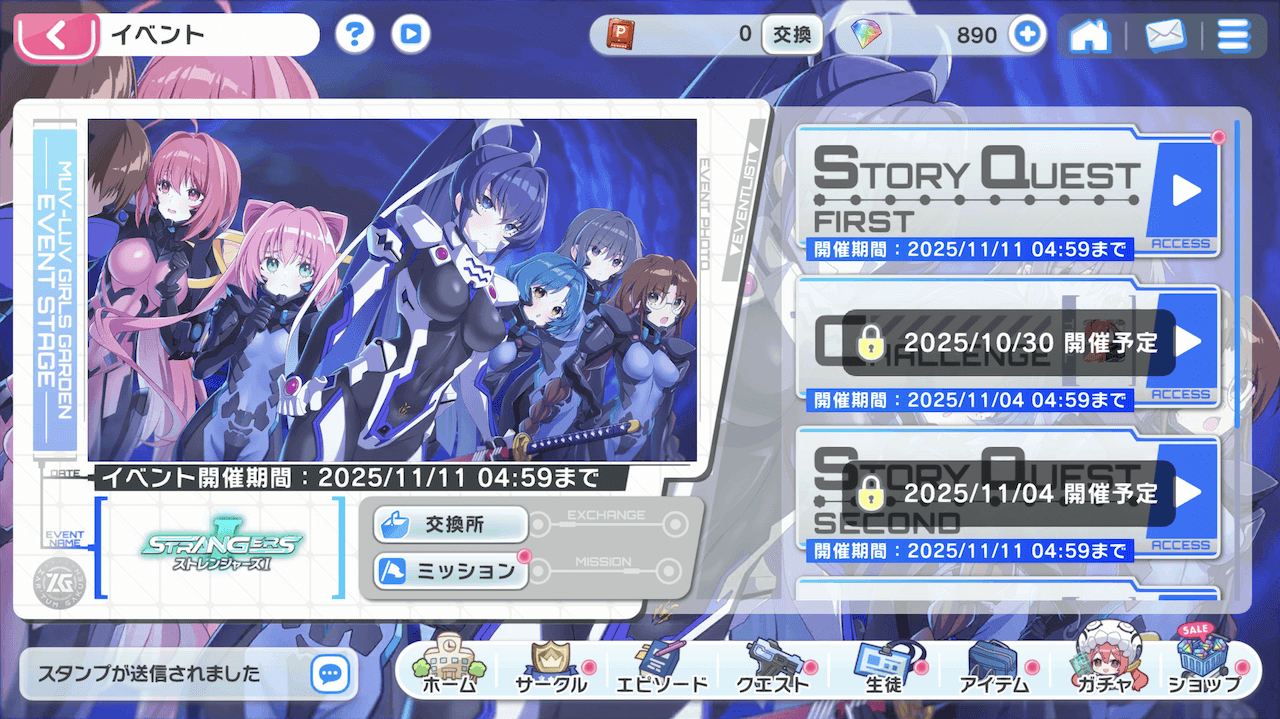 ストレンジャーズⅠは、11月4日から後半が始まる2部構成のイベント。ほかにも、「鑑純夏」「御剣冥夜」「珠瀬壬姫」を使ったチャレンジクエストが実施されており、従来通りであれば交換所のラインナップは後半でスキルレポートが追加される。