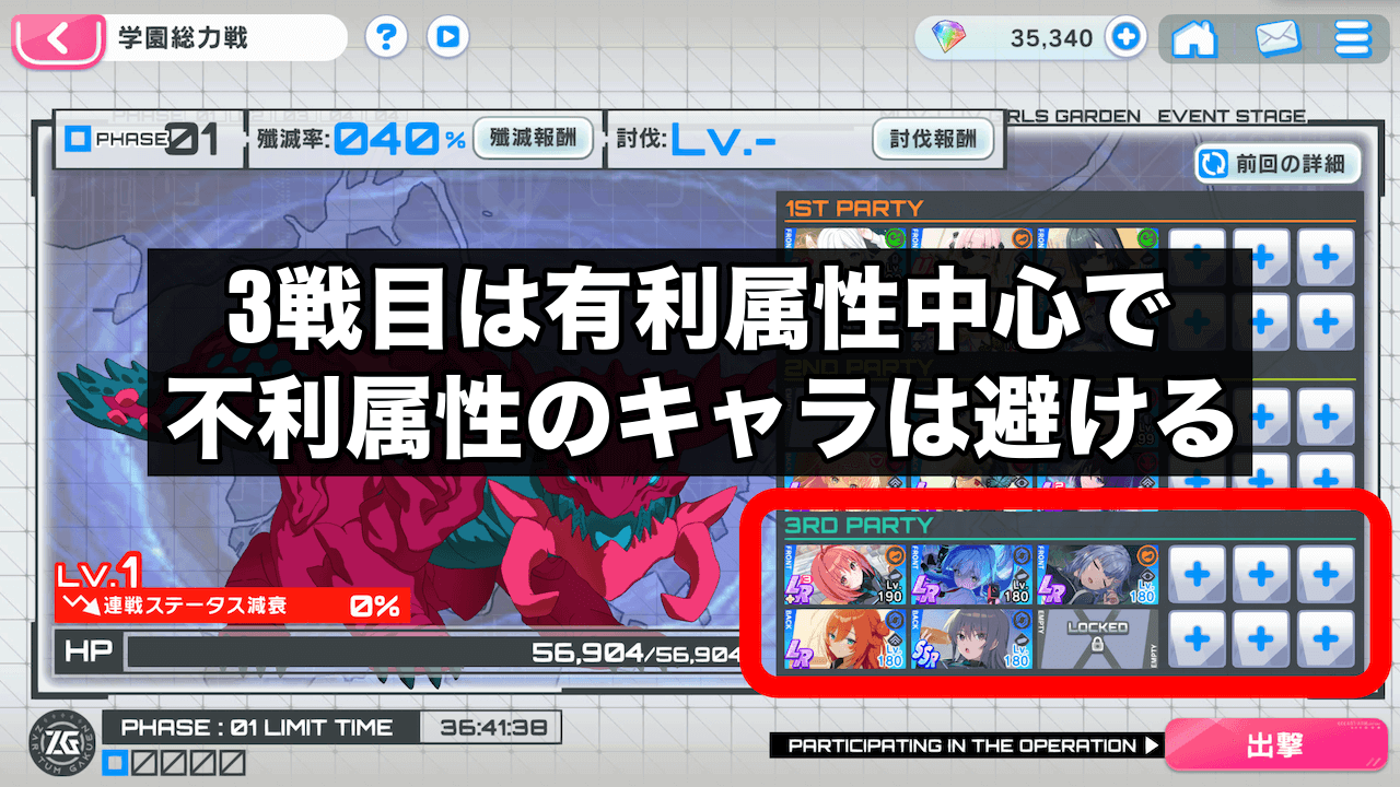 3編成目のパーティは、敵の数も減っていてボスを倒すのみになっている場面が多い。有利属性が多いパーティを3編成目に組みつつ、不利属性になるキャラは編成を避けて、攻守の両方で安定性を取った方が良い。