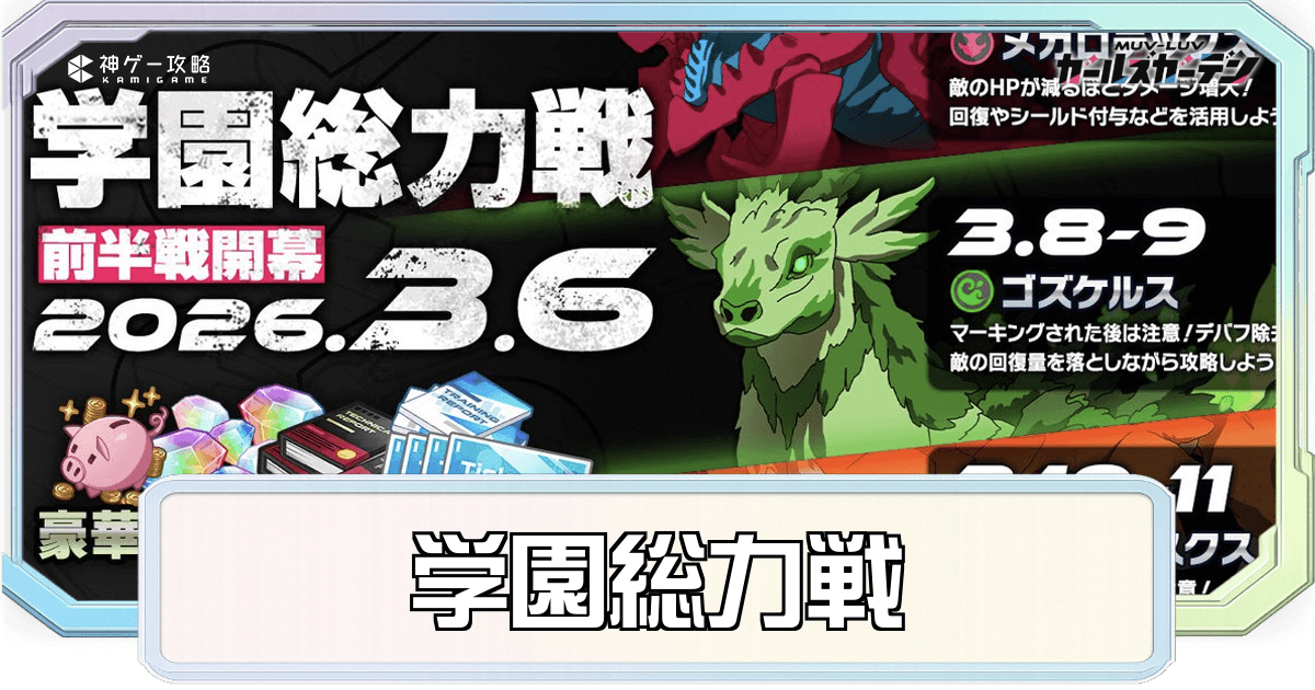 学園総力戦は、1回のバトルに対して最大3つの編成で挑戦し、殲滅率100%を目指すイベントだ。登場する敵は開催期間が決められているため、すべての敵に挑戦するのを忘れないようにしておこう。