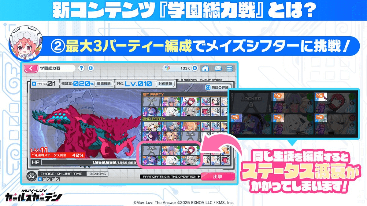 学園総力戦は、最大3つの編成を組めるものの、同じキャラを別の編成で使うとステータスが低下する。ボスを倒して敵レベルを上げた分だけ、同名キャラには連戦ステータス減衰分の減少が適用されるため、同名キャラの使い回しは避けた方が良い。