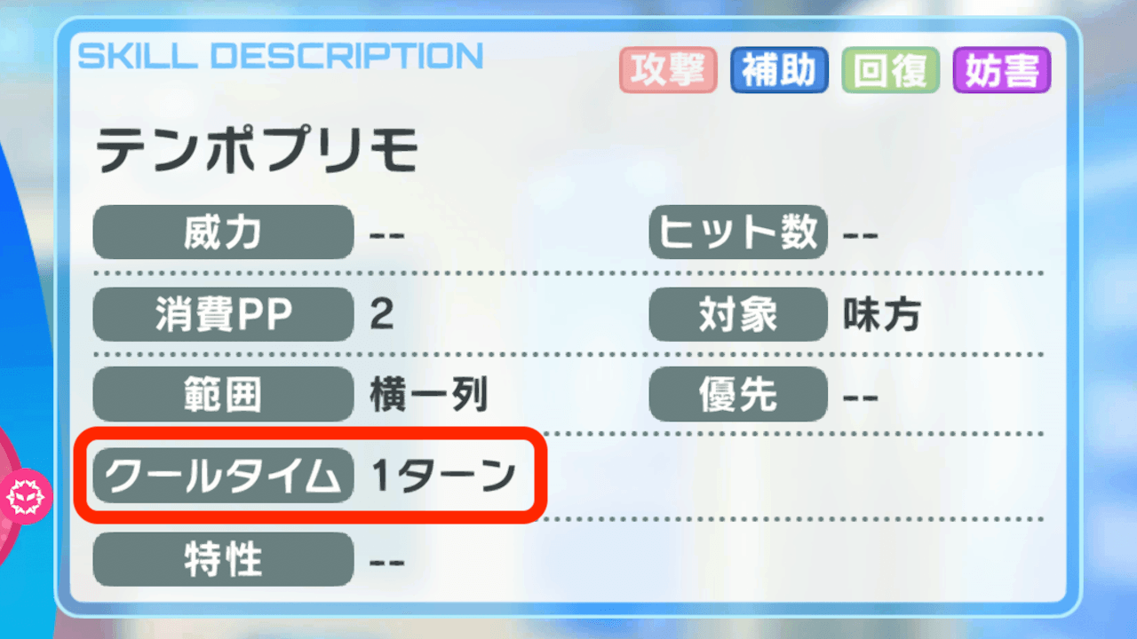 | 2ターン | 1ターン目に使用すると4ターン目に再使用可能(2ターンCTを挟む) |