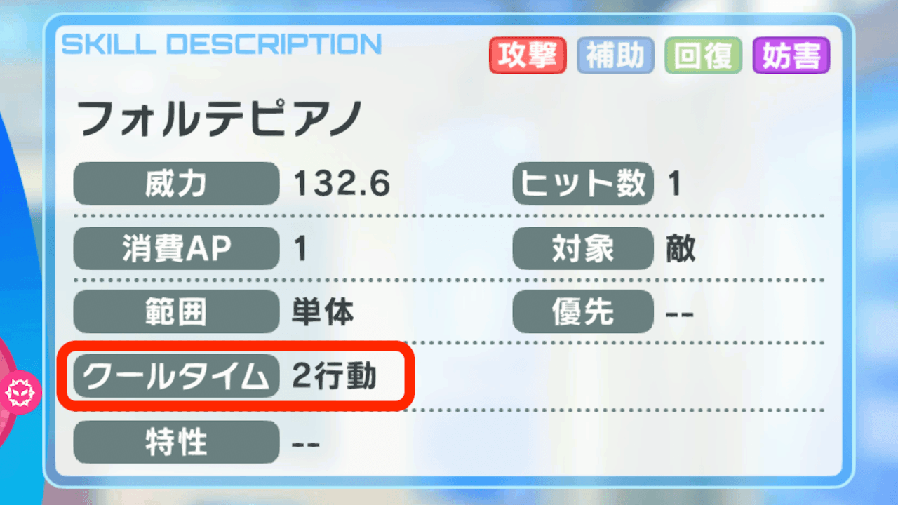 ターン単位のクールタイムは、設定されているターンが経過するとカウントが進む。例えば、1ターン目にクールタイムが1ターンと記載されているスキルが発動したら3ターン目に再使用可能、2ターンになっているスキルは4ターン目に再使用できる。