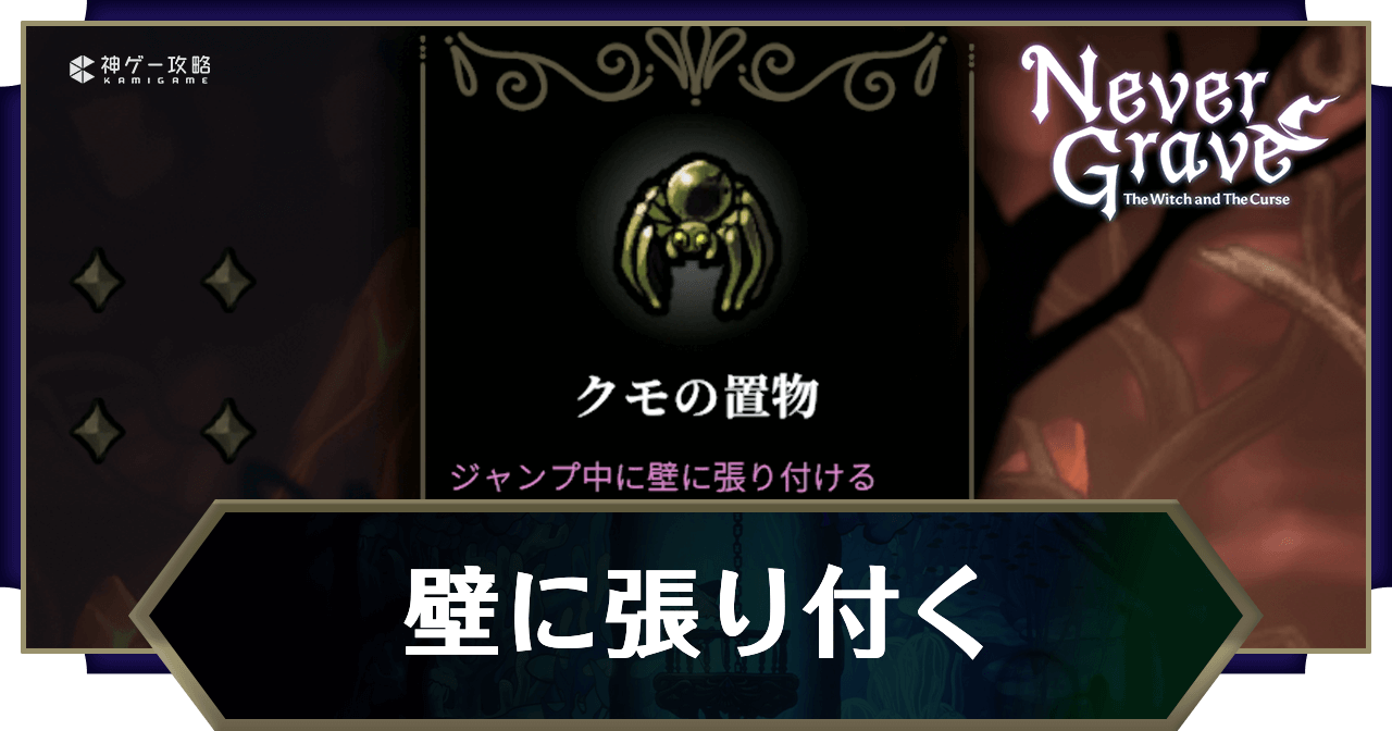 ネバーグレイブ(Never Grave)の「壁に張り付く(クモの置物)」を解説。壁に張り付くの解放条件や使うタイミングについても掲載しています。