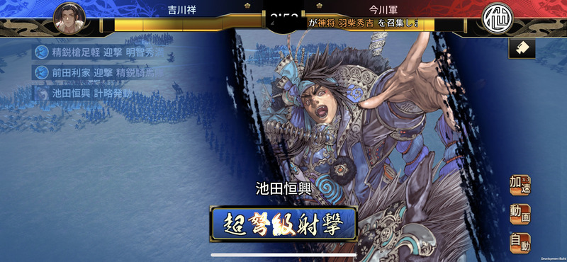 また、バトル中それぞれのキャラクターが発動できるスキルが存在する。スキル発動の演出がキャラクターの特徴を表すものが多く、今川義元のおどろおどろしいスキルや前田利家の巨大な槍による全体攻撃など派手なバトル演出が楽しめるぞ。