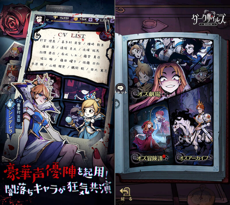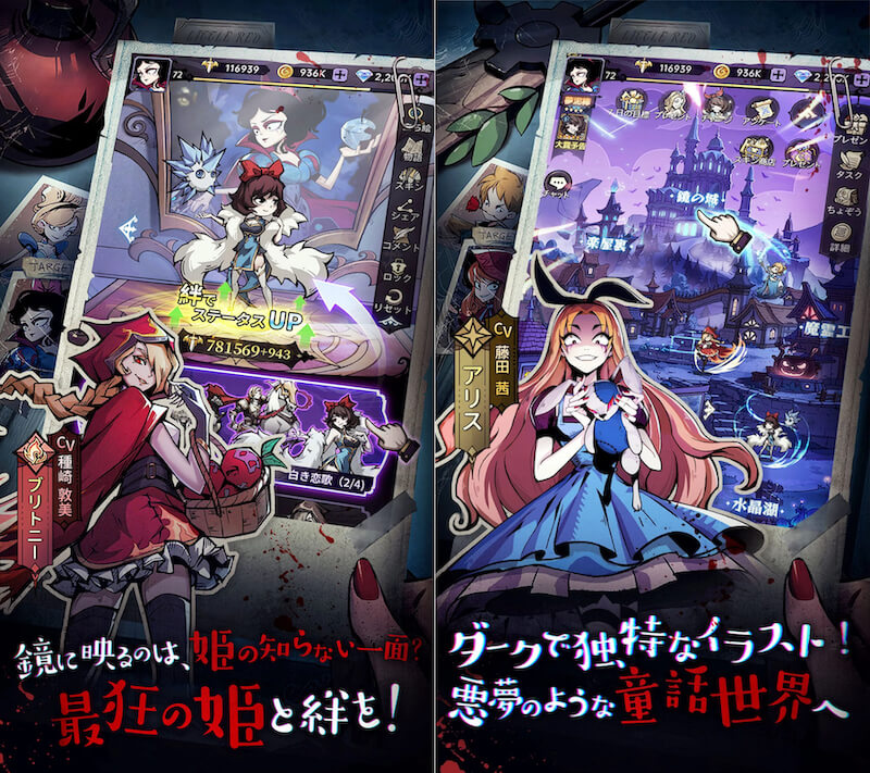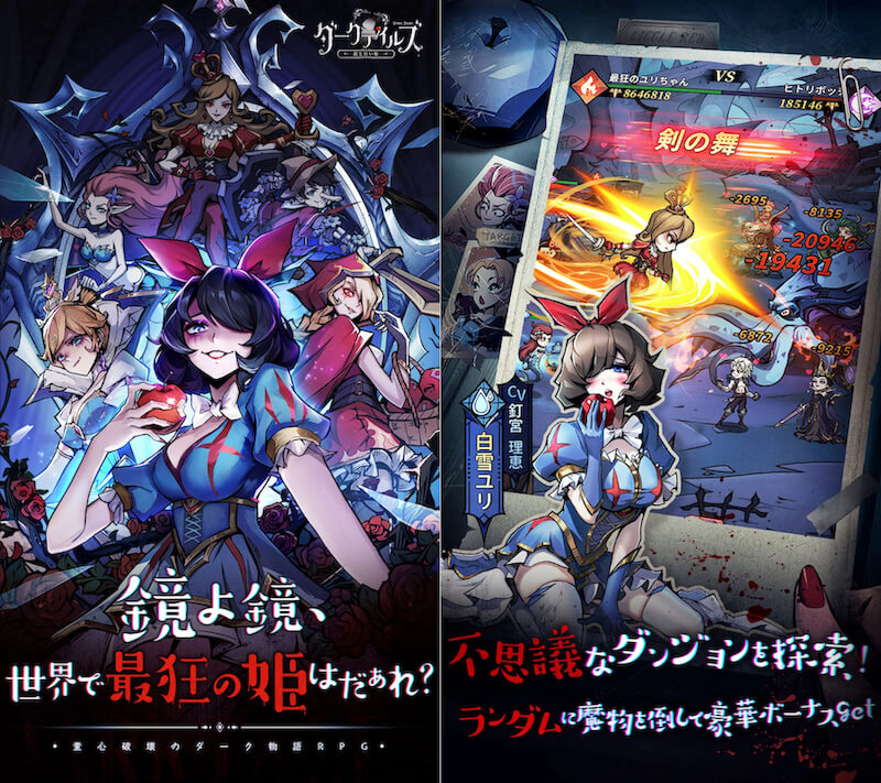 『ダークテイルズ~鏡と狂い姫〜』は、悪夢のような童話世界を舞台にしたRPGだ。あざとい白雪姫、腹黒い赤ずきん、短気な星の王子さま……など従来のイメージとはかけ離れた登場人物の姿を、かわいいがダークさを感じる独特な2Dイラストで描かれた世界を通して味わえる。