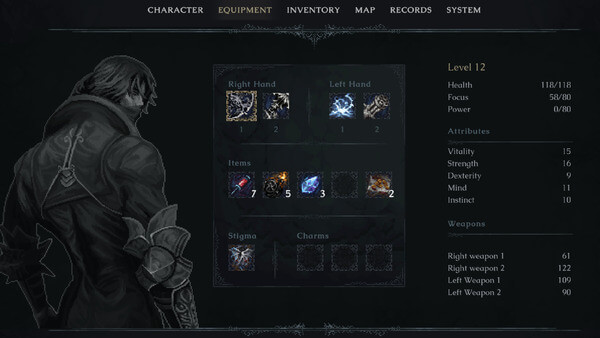 ただし、右手武器(近距離武器)と左手武器(遠距離武器・魔法)は各2つずつ持て、任意のタイミングで装備の変更もできるため、汎用性を重視してDexiterityをメインで伸ばしつつ、Mindを少し伸ばし、場所に応じて魔法を切り替えていく……などの育成も面白そうです。