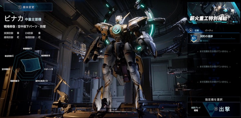 また、外部アーマーを装着しており、HPがゼロになったらアーマーをパージして、内部のフレームだけで戦える。さらに一度の出撃につき一度までアーマーを再装着できる。高い継戦能力を活かして、相手の弱点を突くのが基本的な戦い方だ。そのため、敵機体に対する知識が必要な中級者〜上級者向け機体でもある。