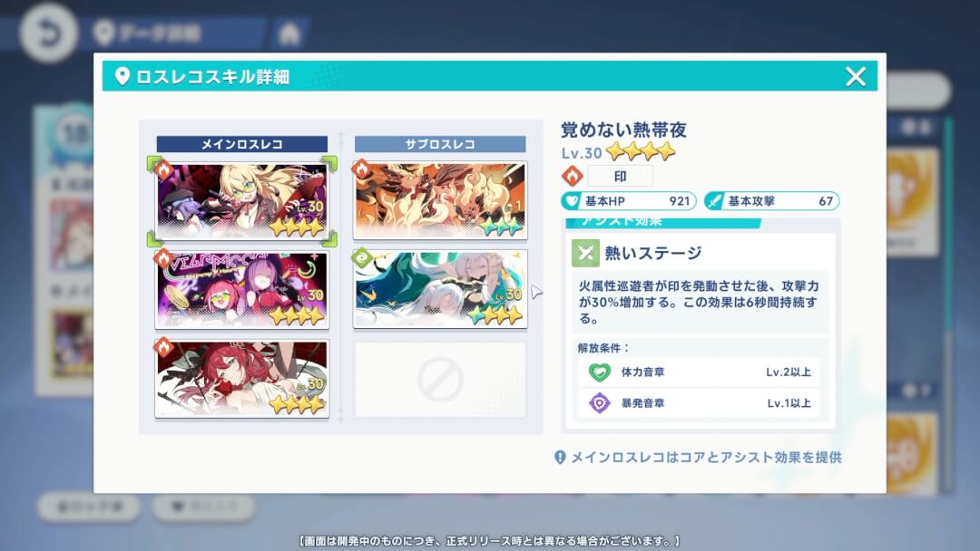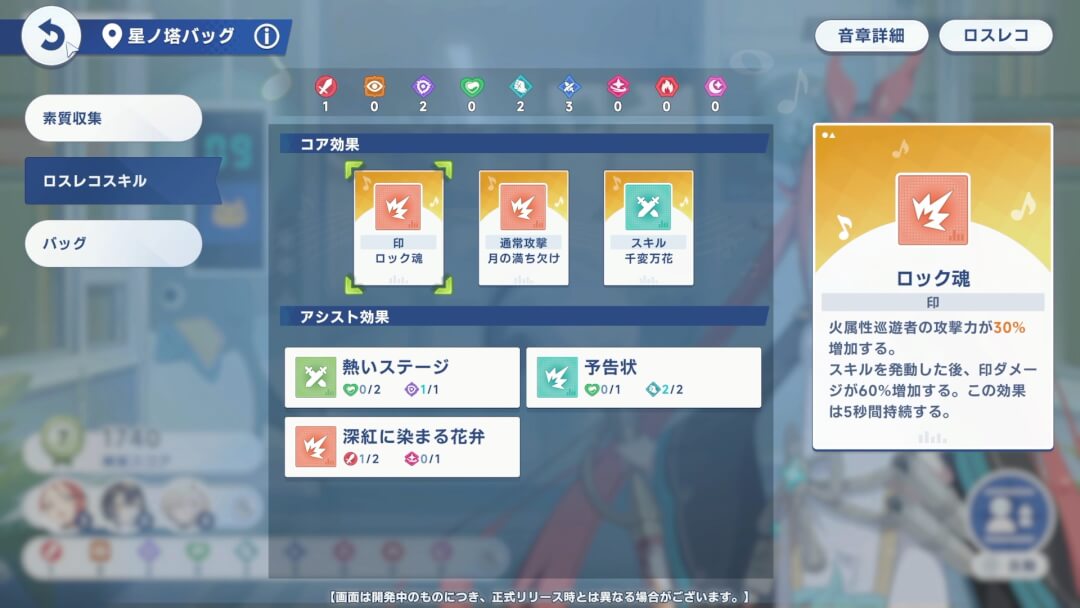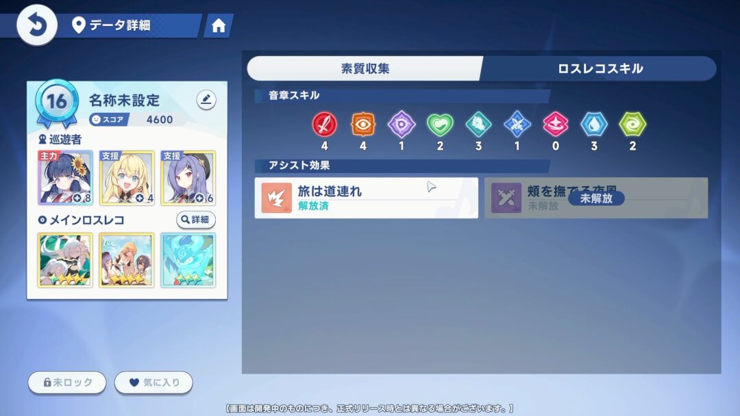 なお、パーティー編成ではキャラクター3人に加えて、「ロスレコ」と呼ばれる装備品もセットする。データにはキャラクターとロスレコの組み合わせも保存され、音章スキルの数によってはロスレコが「アシスト効果」を発現させていく。