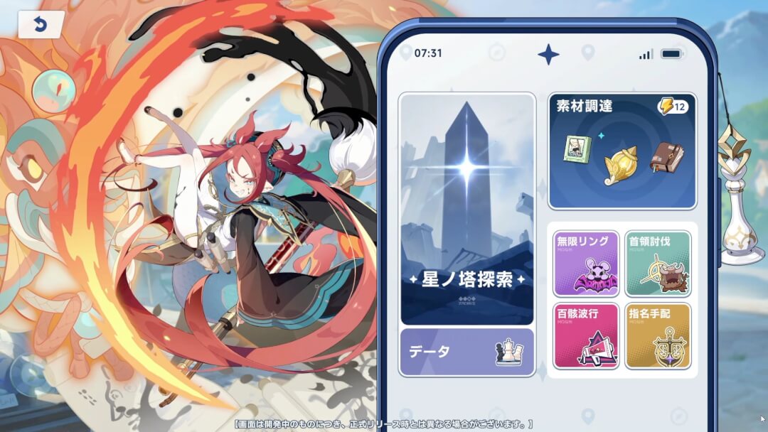ステラソラにおいて重要なコンテンツは「星ノ塔探索」だ。探索は階層を踏破していく形で行われ、各階層では敵との戦闘やイベントが発生する。戦闘報酬やイベント結果にて、キャラクターの強化要素である「素質」や「音章スキル」が手に入り、探索終了時に強化結果が「データ」として保存される。