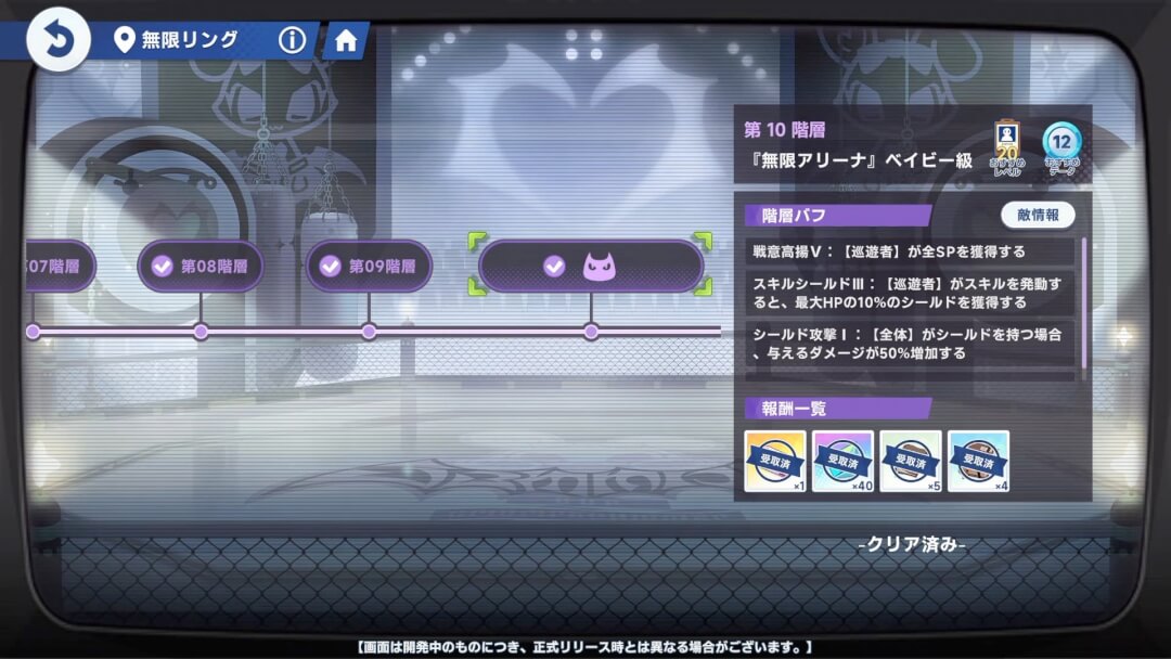 | 無限リング | ・難易度や属性ごとに別れたリングで01階層から10階層までの突破を目指す ・階層ごとに豪華なクリア報酬が用意されている ・何度も挑戦できるが報酬は一度のみ ・リングごとに特殊なルールがあり、ルールを前提としたデータを持ってくると突破しやすい |