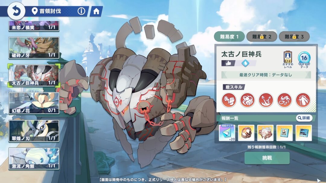 | 首領討伐 | ・属性ごとに用意されたボスに挑戦できる ・ボスごとに週1で挑戦でき、倒せばレアな育成素材がもらえる ・属性ごとに強い「データ」を用意しないとボスは倒せない |