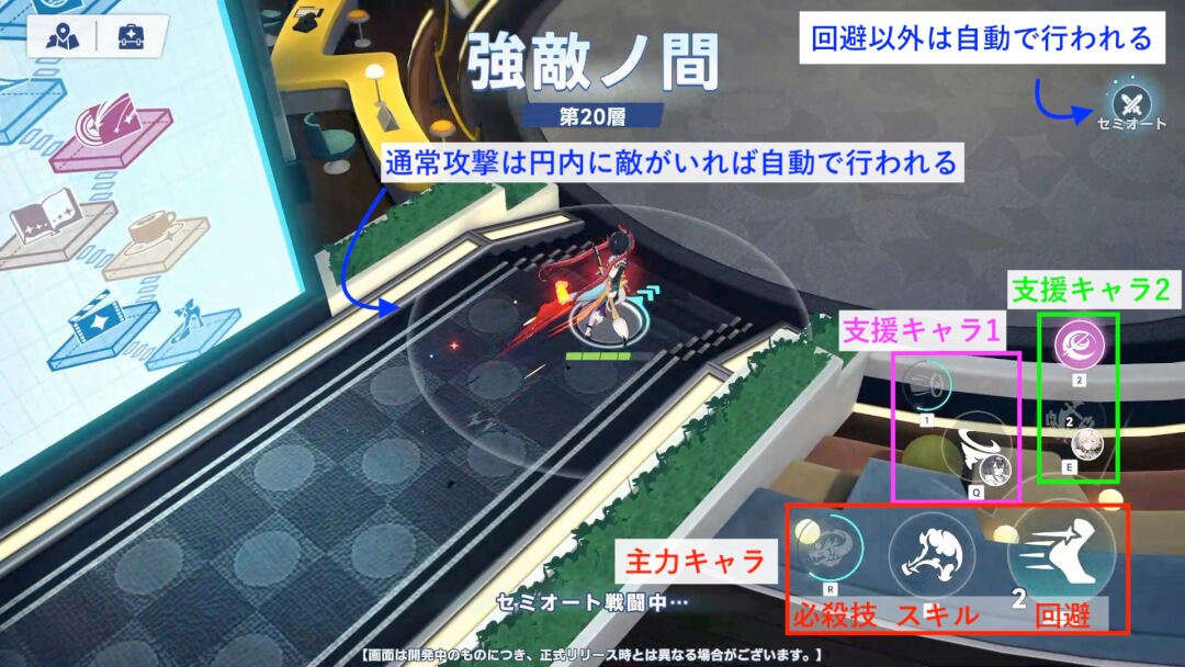 通常攻撃は主力の周囲にあるサークル内にいる敵へと自動で行われるぞ。セミオートにすれば、各キャラのスキルと必殺技も自動で使われるため、大量に出る敵を素早く殲滅する必要がある場合などはセミオートにしつつ、回避に専念すると良い。