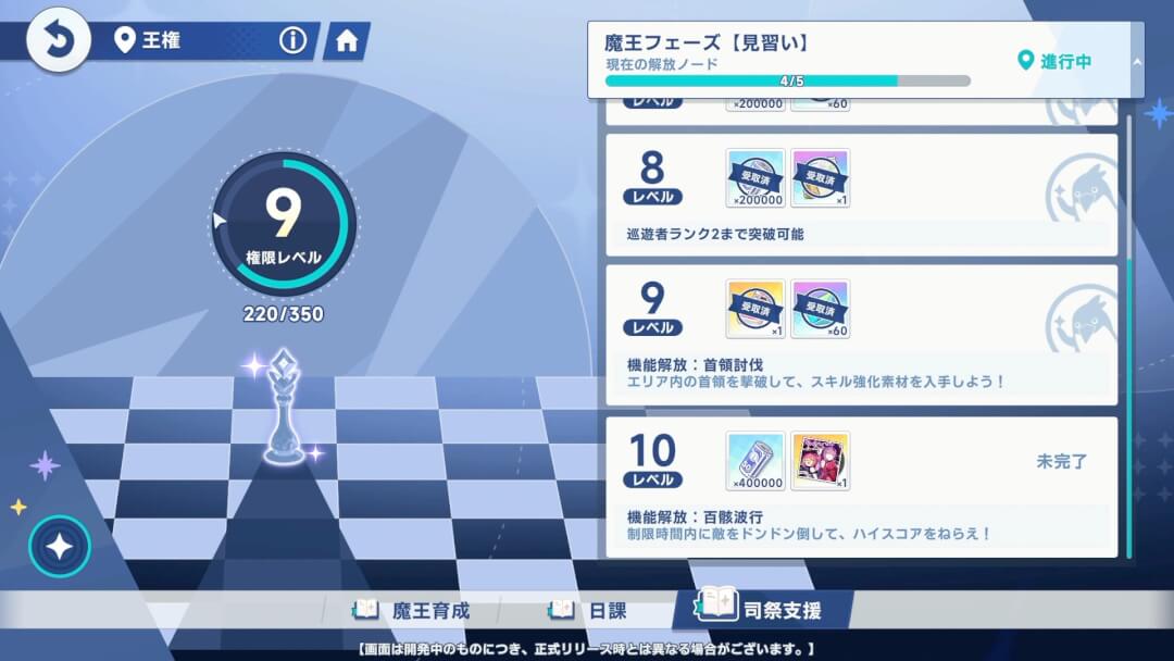 プレイヤーレベルにあたる「権限レベル」を上げれば、新しいコンテンツや既存コンテンツの高難易度ステージが開放されたり、メインストーリーが開放されたりする。そのため、より強い「データ」を作ったり、育成効率を上げたりするためにも権限レベルを上げる必要がある。