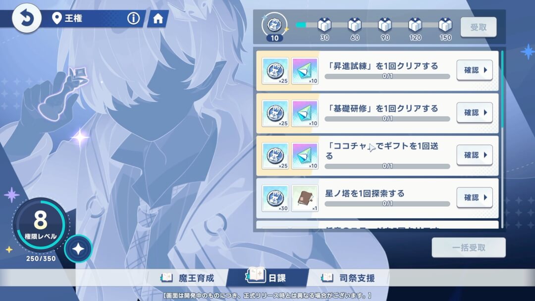 権限レベルは、「日課」と呼ばれるデイリーミッションをクリアするか、「素材調達」でやる気(スタミナ)を消費すると経験値が蓄積され、経験値が一定になると上がる。やる気を回復するアイテムには限りがあるため、毎日コツコツと上げる必要があるぞ。