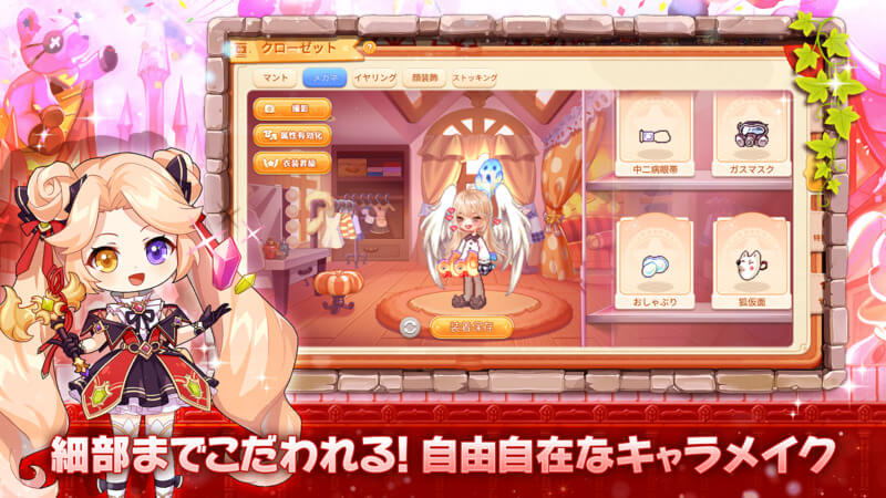 | 衣装 | ローブ、トップス、ボトムス、マント、帽子、グローブ、シューズ、盾、メガネ、イヤリング、顔装飾、ソックスの見た目を変えられる |