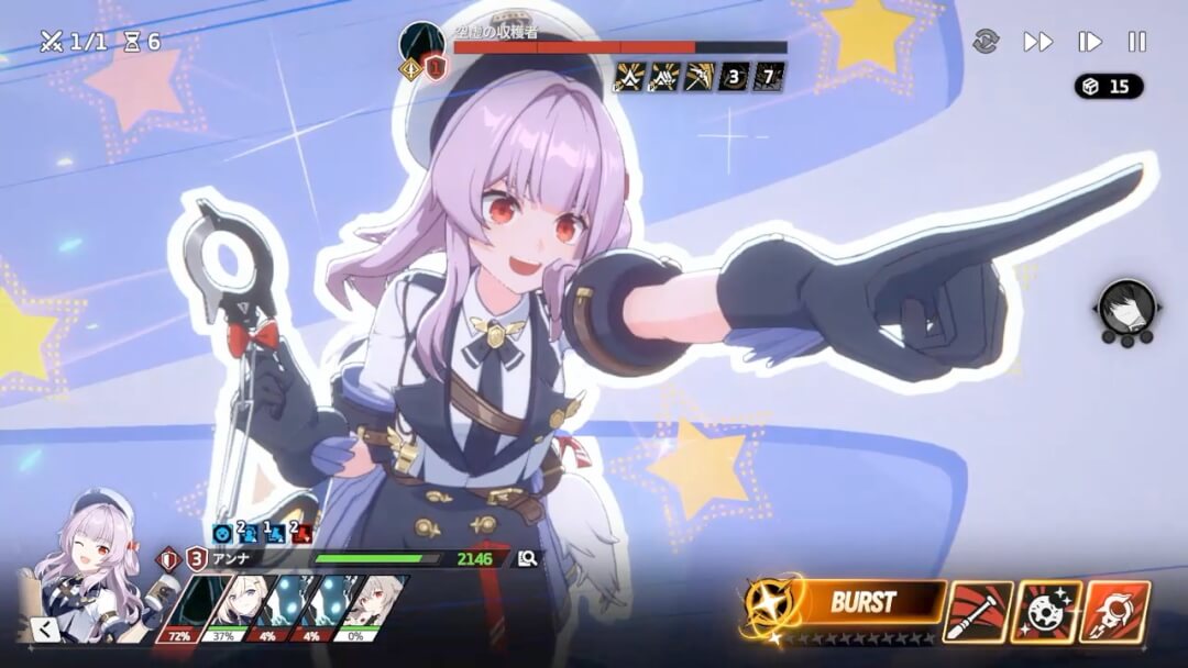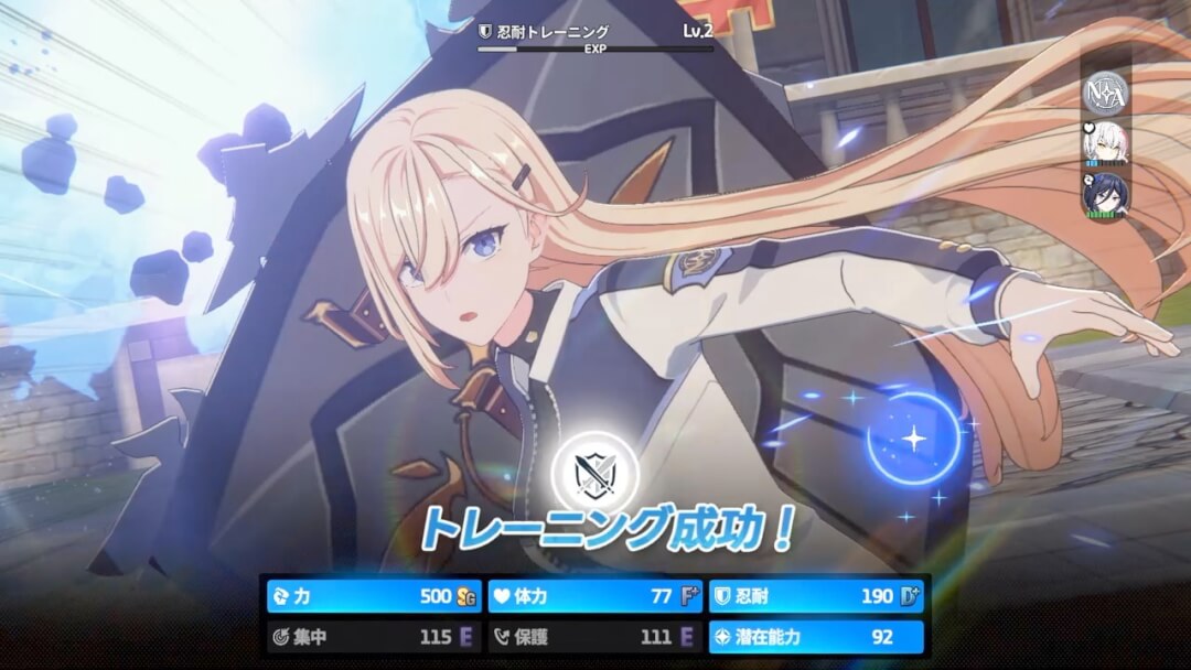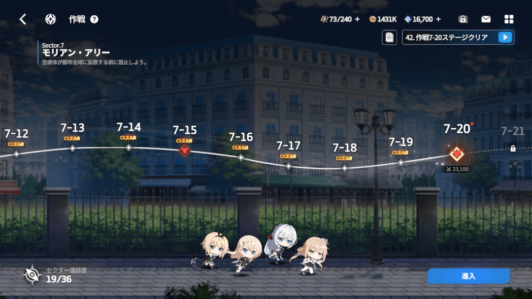 | 作戦 | ・バトルそのものがメインのコンテンツ ・少しずつ敵が強くなるステージを攻略していく ・攻略状況に応じて、他コンテンツが解放されたり、時間経過で育成素材を蓄積する「NOA支援金」の蓄積量を増加させていく |