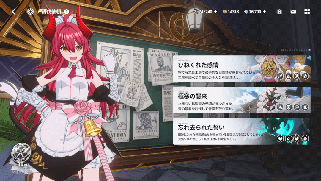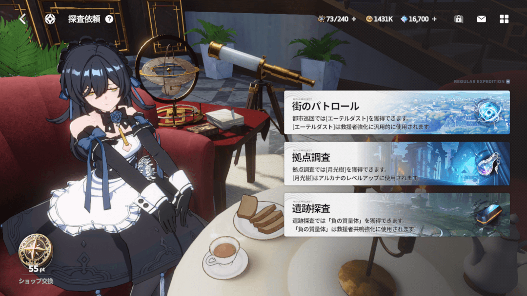 | キャンペーン | ・育成素材がもらえるステージで周回できる ・討伐依頼、探査依頼、キューブパレス、星間回廊など種類があり、もらえる素材が異なる |