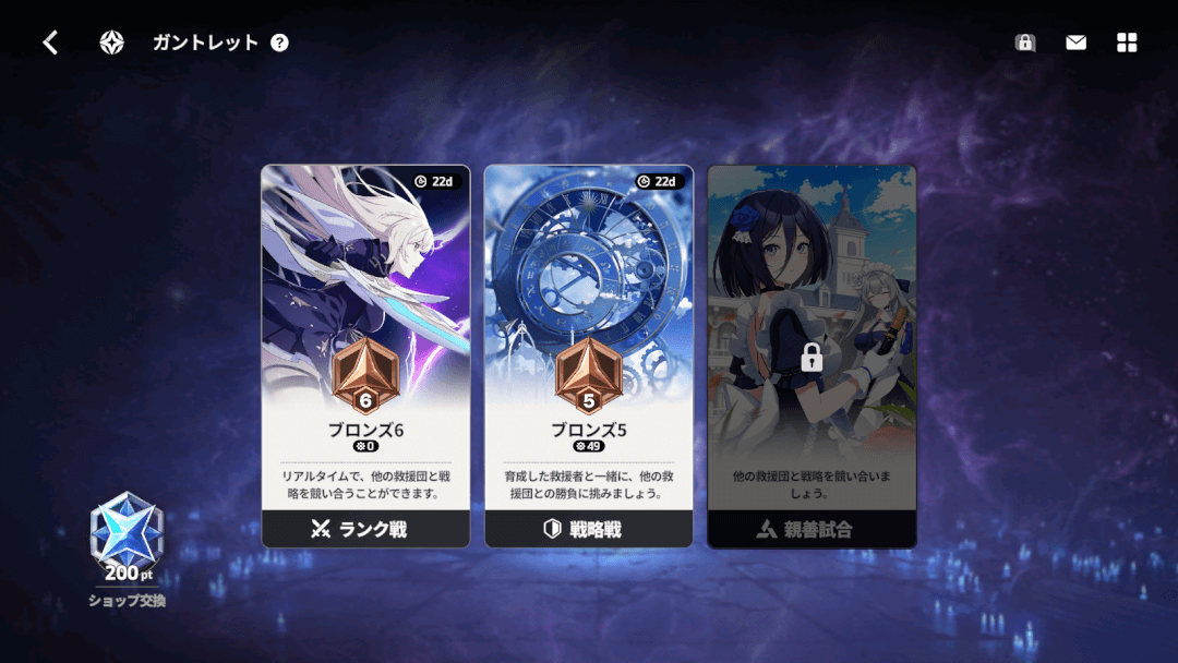 | ガントレット | ・PvPを楽しめる ・リアルタイムで戦う「ランク戦」と非同期PvPの「戦略戦」が存在する ・成績によって報酬がもらえる |