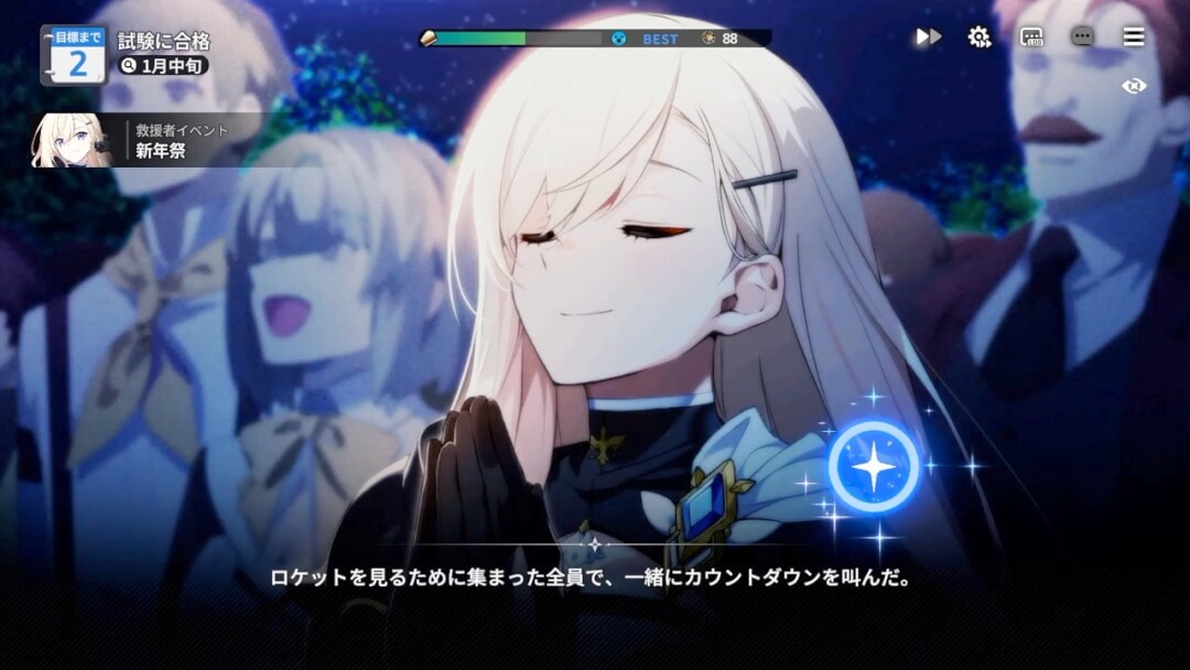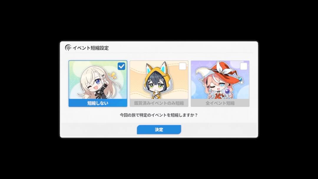 本作のコンテンツでメイン中のメインにあたるのは「救援の旅」だろう。育成ゲームとしてのボリュームも存在する。初回で全イベントをちゃんと読んでいくと1時間半から2時間ほどかかる。しかし、鑑賞済みのイベントをスキップする機能もあり、大幅な時間短縮が可能だ。イベントの全スキップも可能であり、10分から15分程度で終わらせることもできるぞ。