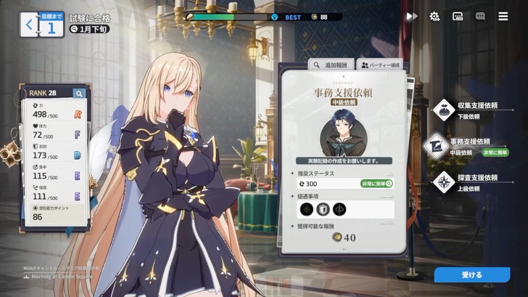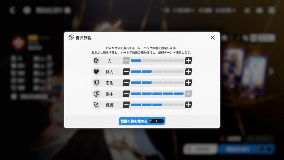 加えて、重視するパラメーターを指定する「自動旅程」にて全過程をスキップして30秒ほどで結果を出すことも可能だ。手動のほうが細かくステータス調整や潜在能力の厳選ができると思うが、忙しい時などでもデイリーミッションはこなしやすいし、思いついたステータス配分をすぐに試したりもできる。プレイヤーの判断で育成の負担は少なくできるぞ。