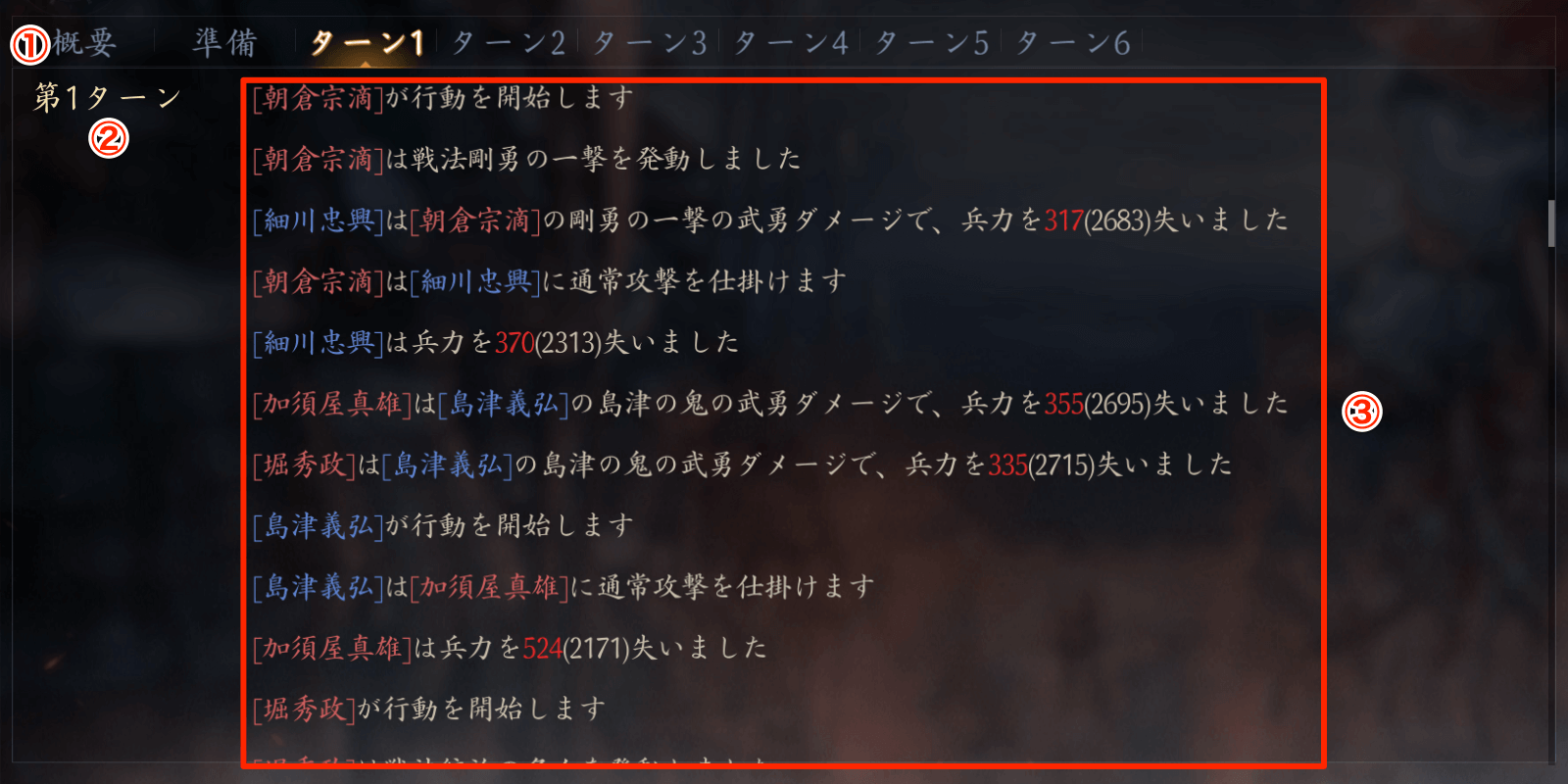 | ① | ターン数各ターンの戦闘ログを表示する |